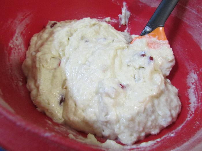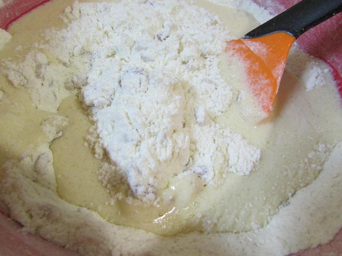 Слегка перемешать. В тесте должны проглядывать комочки муки. Это не позволит орехам и вишне опуститься на дно во время выпечки. Дать постоять 5 минут. Тесто слегка подрастет и загустеет.
