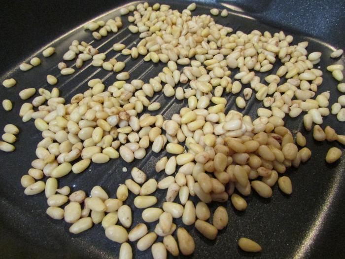 Кедровые орешки прокалить на раскаленной сковороде. Дать им остыть.