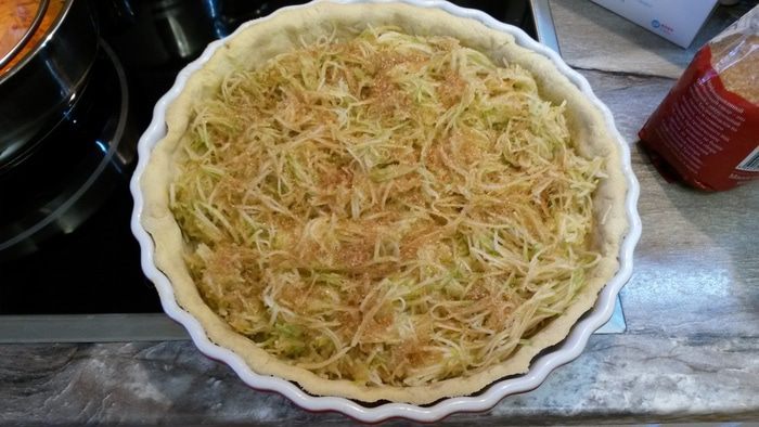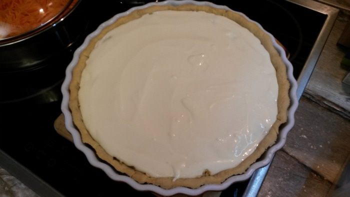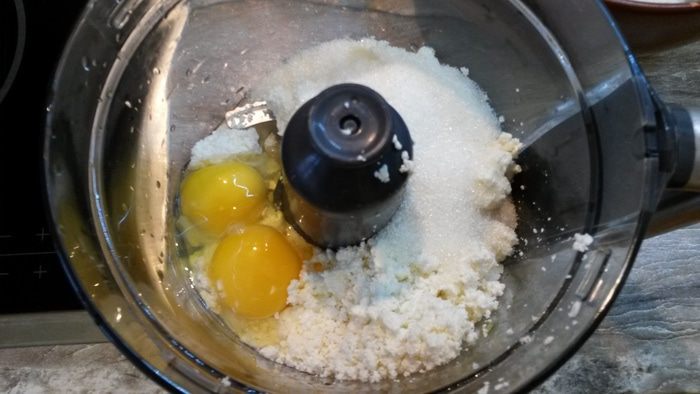 Готовим тесто бризе. Сливочное масло заранее достаем из холодильника, минут за 20. Оно должно немного размягчиться, но еще быть холодным. В кухонный комбайн выкладываем муку, соль и сахар. Сверху нарезаем кубиками масло, добавляем яйцо. В импульсном режиме делаем пару рывков до получения мучной крошки.