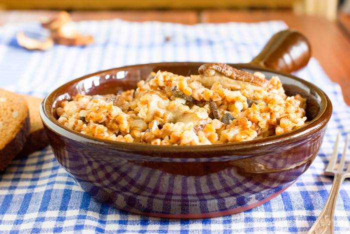 Свежие грибы крупно порежьте, если у вас сушеные грибы предварительно замочите на 15-20 минут в горячей воде, затем воду слейте через сито в отдельную посуду и добавьте в гречотто вместе с бульоном.