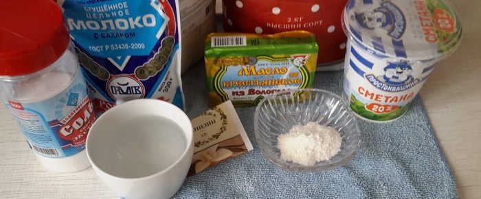 Готовим продукты. Муку надо взять хорошую. Сметану лучше натуральную, пожирнее. Сгущенку и масло уже как хотите, т.к. цены "теперича, не того что давеча". Разрыхлитель я делаю сама, а вот ванилин, конечно, лучше стручковый, но можно и из пакетика, как у меня.