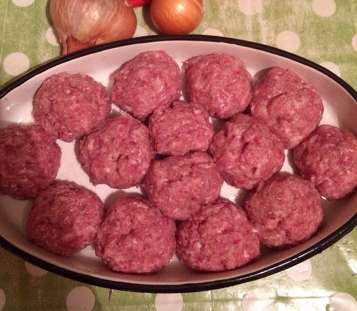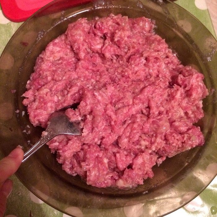 Готовим фарш. Пропускаем через мясорубку кусочки свинины, хлеб (размягченный в воде), лук и добавляем яйцо, соль и молотый перец. Фарш тщательно перемешать.
