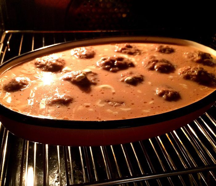 Заливаем соусом котлеты и ставим выпекать на 30 минут при температуре 220°C, под конец можно убавить до 190°C.