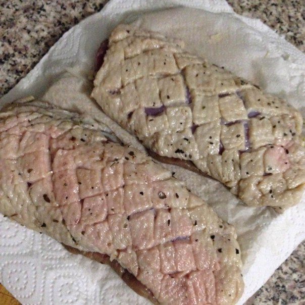 Жарить начинаем со стороны шкурки, чтобы по максимуму выжарить жир и получить корочку, а уже за тем переворачиваем на другую сторону.