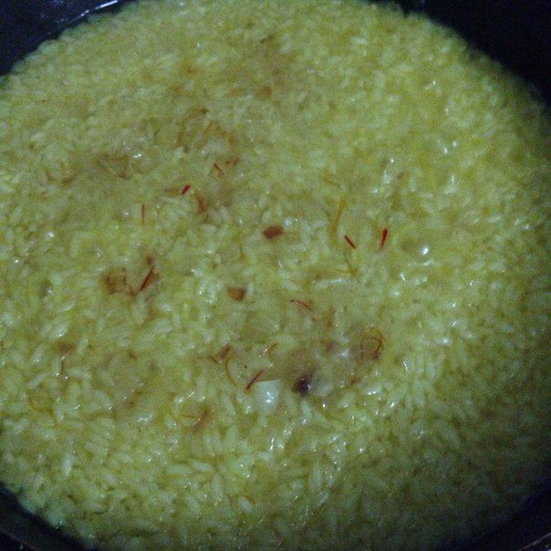 Затем заливаем шафраном с водой и оставшуюся воду. После того как рис закипит, убавляем огонь, и так рис должен повариться без крышки пока вода почти пропадет и не начнут так сказать появляться горочки, теперь накрываем крышкой и варим еще минут 5. Снимаем с огня и перемешиваем вилкой рис. Рис готов.