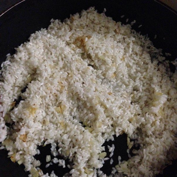 Затем высыпаем промытый рис и обжариваем минут 5.