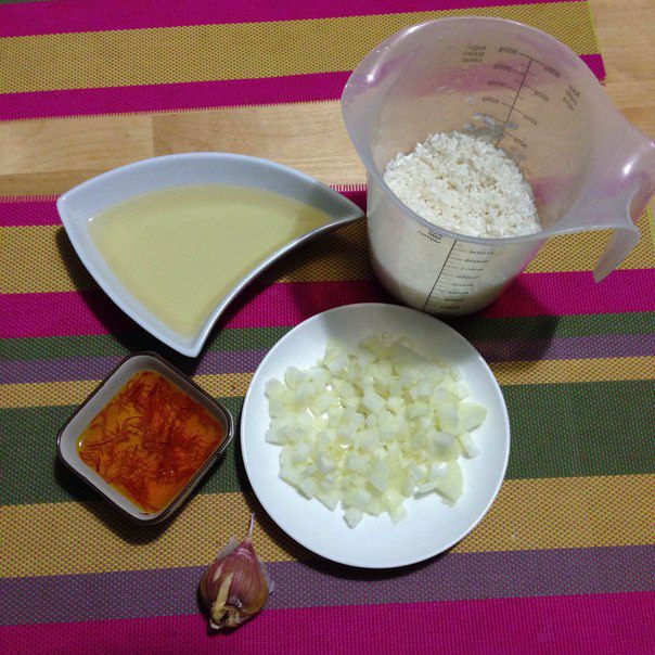 Для этого рис промываем под водой 3-4 раза. Шафран заливаем теплой водой где-то 125 мл и даем настояться.