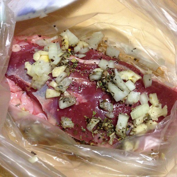 В пакет кладем две грудки, приправляем солью, орегано, перцем, мелко режем лук, чеснок, и тоже кладем в пакет к грудкам, заливаем коньяком и завязываем пакет, предварительно убрав воздух. Кладем в холодильник на 3-4 часа, но я оставляла на 12 часов.