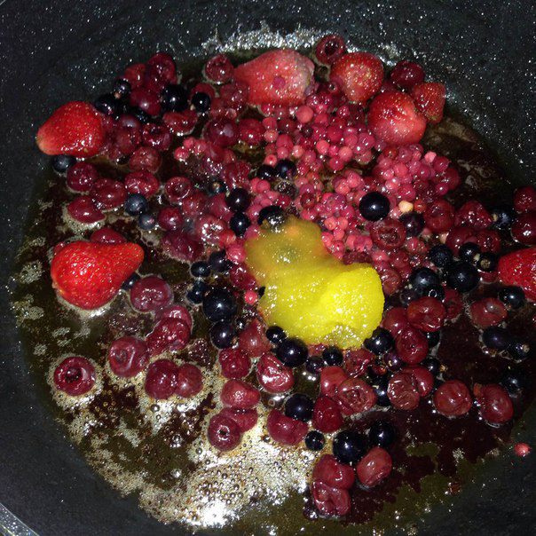 Теперь пока грудка отдыхает, делаем соус, все ягоды и мед выкладываем на сковороду, где жарилась грудка.