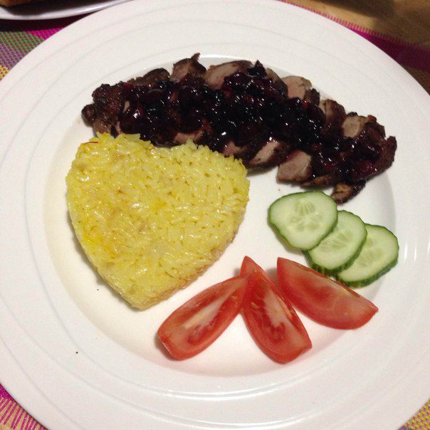 Утиная грудка в маринаде, с ягодным соусом и гарниром из риса с шафраном! Это прекрасный и вкусный ужин!