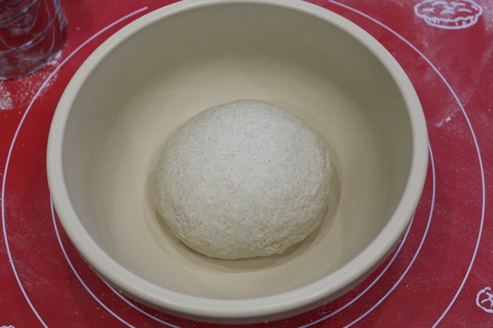 Вымесите мягкое, эластичное, гладкое тесто. Положите тесто в миску, затяните миску пленкой и оставьте для брожения на 1-1.5 часа до увеличения вдвое, с обминкой через полчаса после начала брожения.