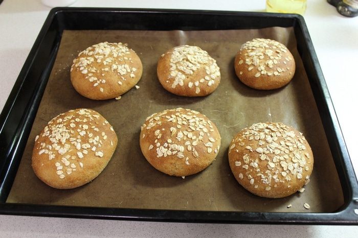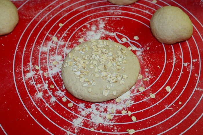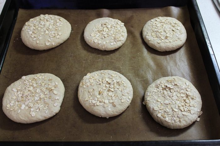 Затем расплющите каждую булочку в лепешку, смочите водой и посыпьте хлопьями.