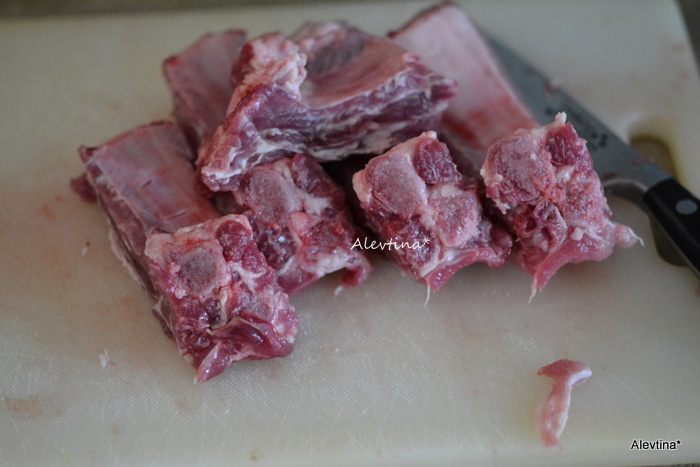 Свиные ребра помыть, пройтись острым ножом со стороны кости, так чтобы были видны разрезы как на фото.