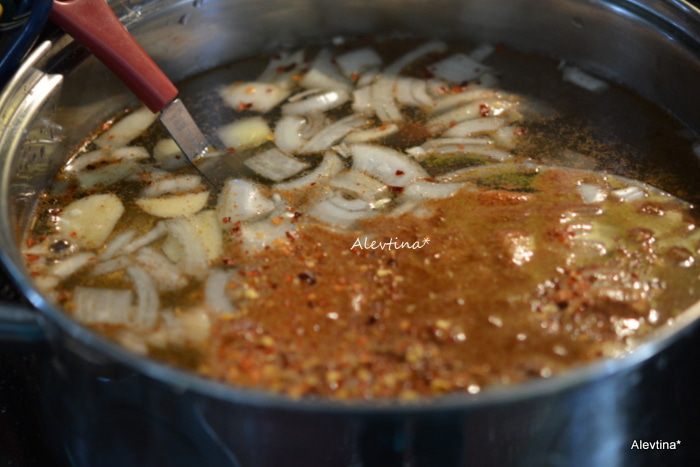 Приготовим маринад. В холодную воду налить рисовый уксус, луковицу половину нарезать, также чеснок, добавить специи и лавровый лист. Поставить на огонь и довести до кипения.