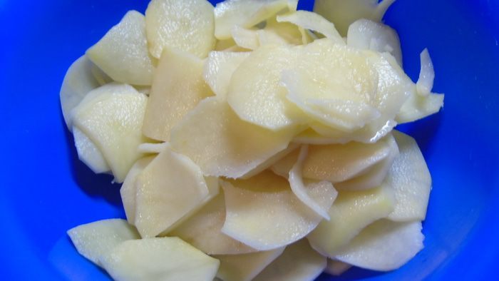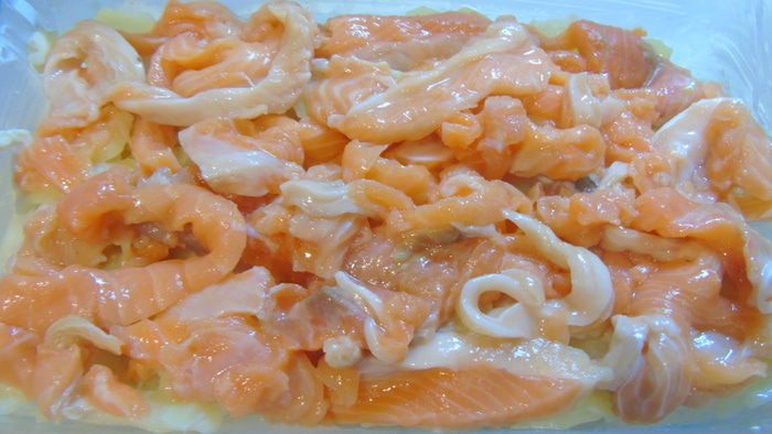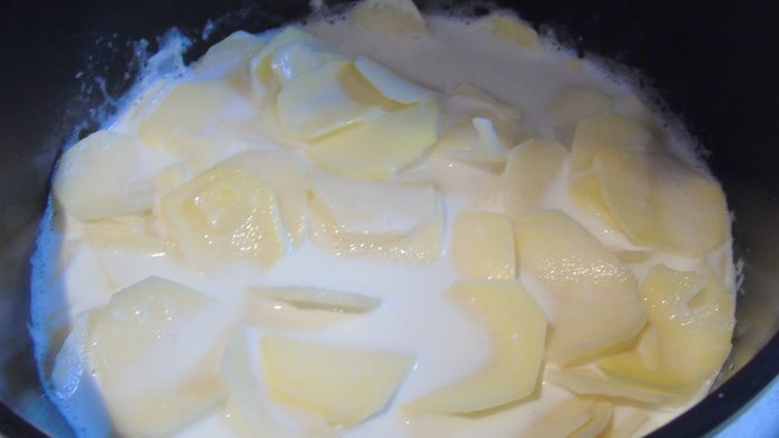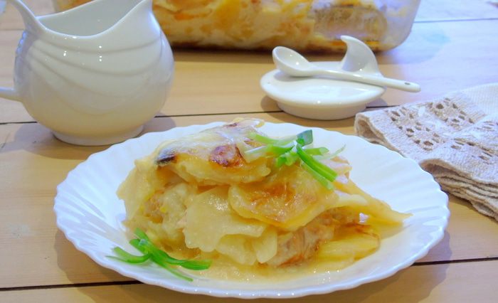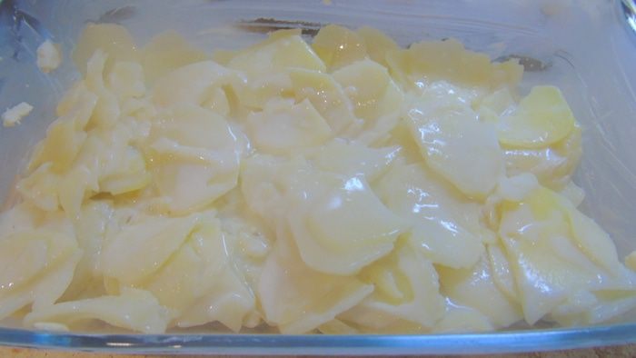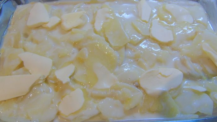 Выкладываем оставшийся картофель. Молочный соус чуть увариваем на слабом огне минут 5, если же он и так у вас вышел густым, то просто пропускаем этот шаг и заливаем им картофель. Сверху раскладываем кусочки сливочного масла и отправляем в разогретую до 180°C духовку до легкой или не очень легкой, как у меня, румяности.