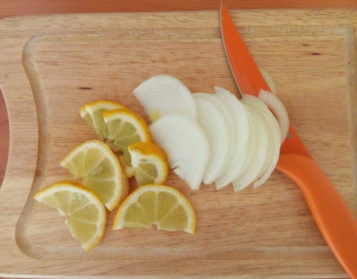 Из оставшейся половины лимона выжимаем сок и сбрызгиваем им рыбу, солим, перчим и помещаем в брюшко лук и лимон.