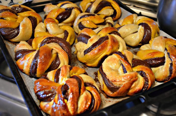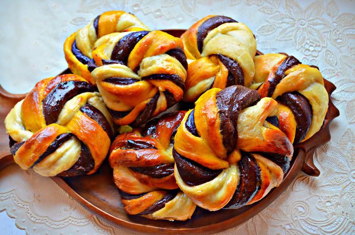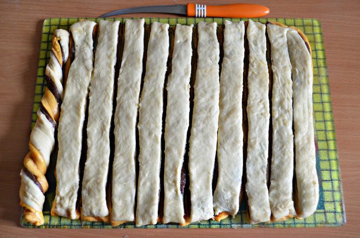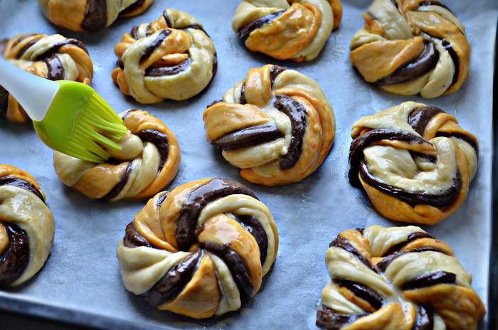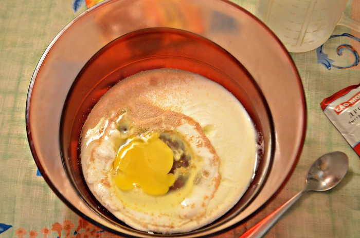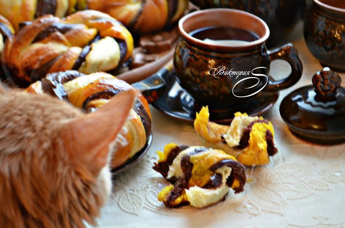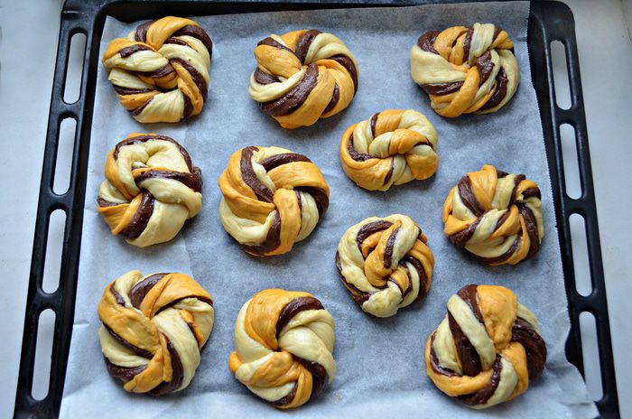 Для каждого вида теста смешайте соль, сахар (сладкоежки могут смело увеличить количество сахара), яйцо, кефир, растопленное сливочное масло, дрожжи, просеянную с разрыхлителем муку. В ту часть теста, которое будет с какао, 1-2 ст л муки не докладывать, она пригодится позже при раскатывании. Замесите тесто.