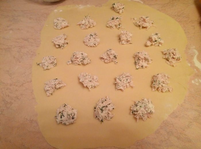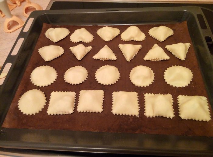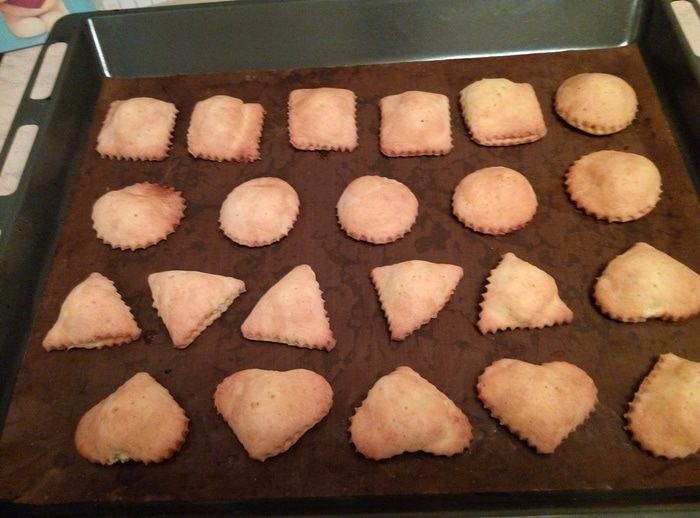 Теперь приступаем к непосредственному формированию пирожков. Я воспользовалась формочками для равиоли с зубчатым краем, можно формочками для печенья, можно стаканом, а можно нарезать квадратики и свернуть из них треугольнички. Обращаю внимание, что если будете использовать формы для печенья, стакан или будете готовить в форме треугольников, пройдитесь по краю вилкой, чтобы они не раскрылись.
