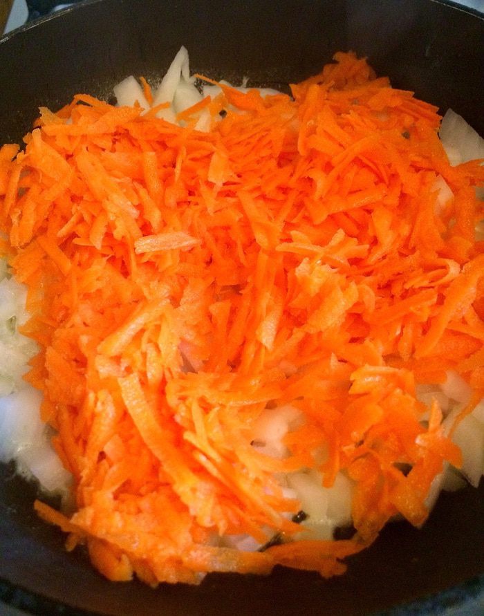 В первую очередь обжариваем репчатый лук, затем морковку.