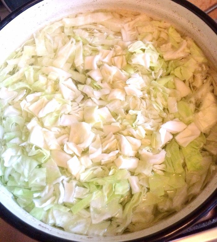 Тем временем режем капусту и закидываем в бульон с картофелем.