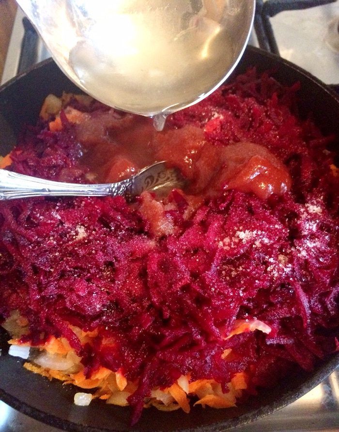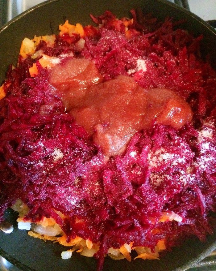 Пока лук и морковь обжаривается на маленьком огне, трем свеклу на терке и добавляем в сковороду. Затем кладем томатную пасту, лимонный сок, соль, сахар.