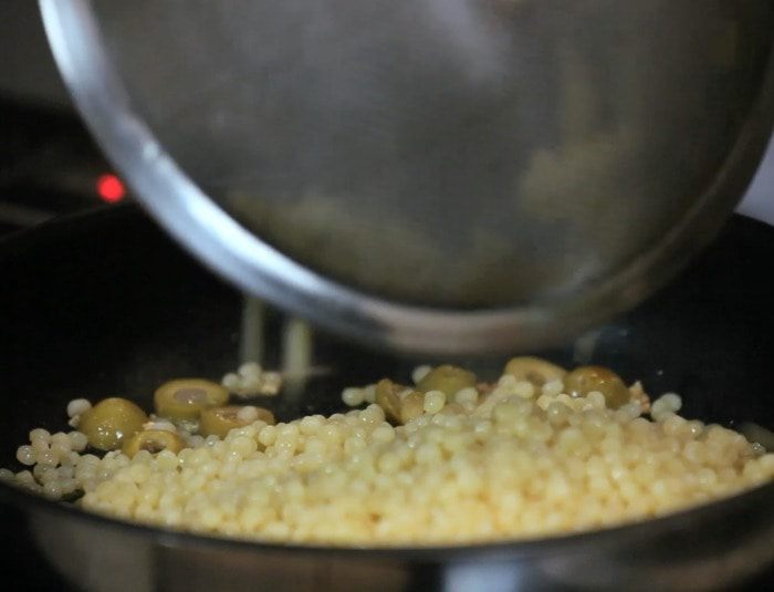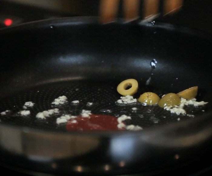 Затем добавить оливки и обжарить ещё пару минут.