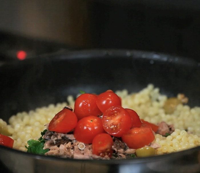 Затем тунец, петрушку и помидоры.
