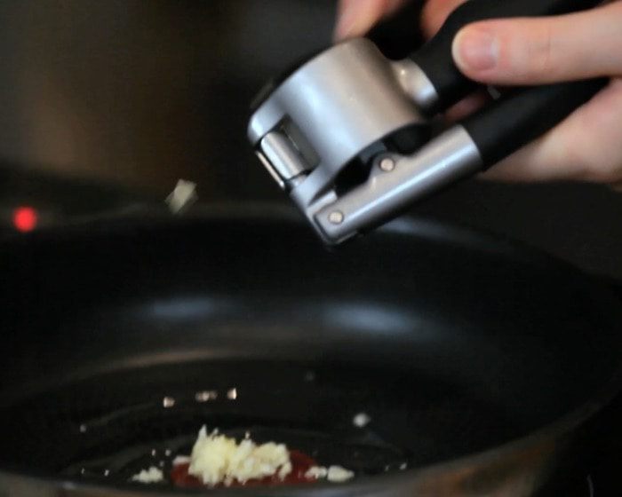 Отварить макароны согласно инструкции. Обжарить на оливковом масле чеснок пару минут.