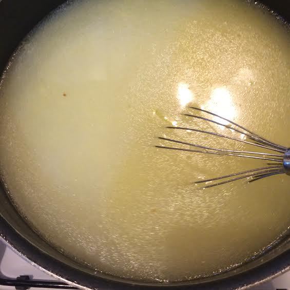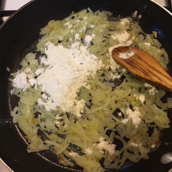 Добавляем 1 ст.л муки и перемешиваем. Возвращаем бульон на огонь и при постоянном помешивании вводим лук. Варим 10 минут.