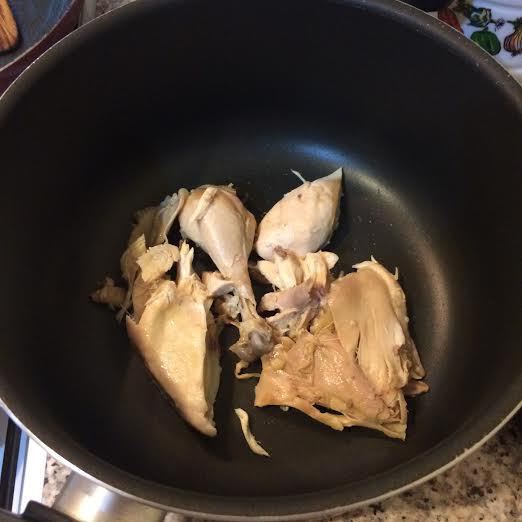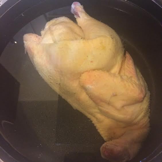 Курицу залить водой, дать закипеть, снять пену, бросить лавровый лист и варить на медленном огне до готовности.