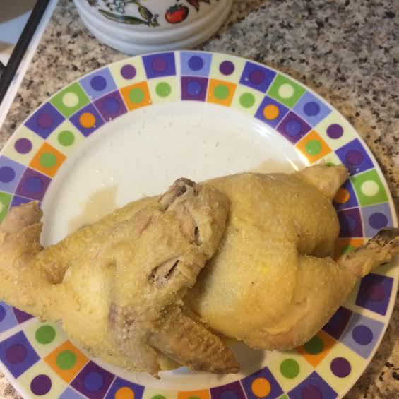 Готовую курицу достаем из бульона, посыпаем крупной солью и даем остыть.