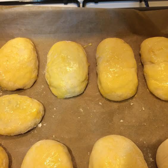 Противень застелить бумагой для выпечки. Выложить пирожки. Смешать 1 желток и 2 ст.л молока и смазать пирожки. Дать пирожкам подняться (10 минут).