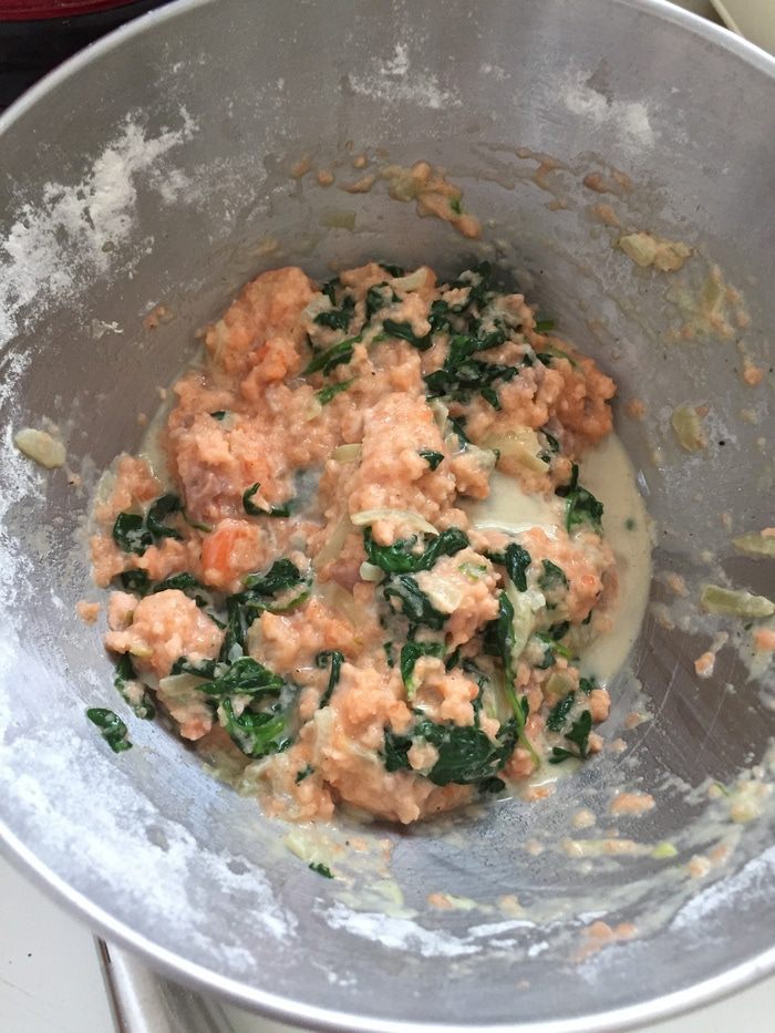 Филе лосося измельчаем в блендере. Соединяем со шпинатом и луком. Фарш готов.