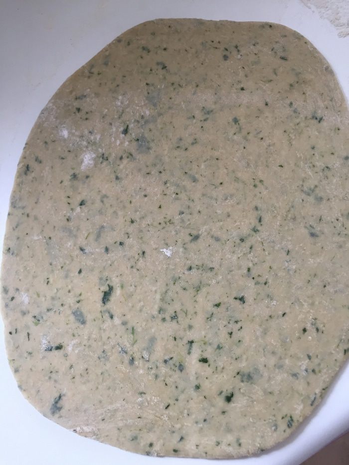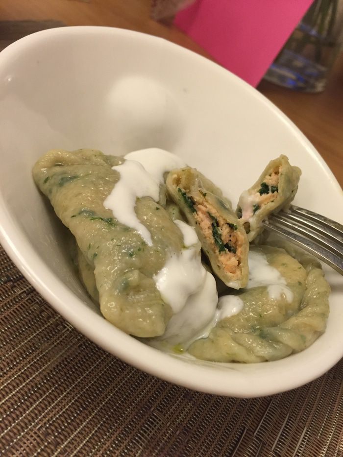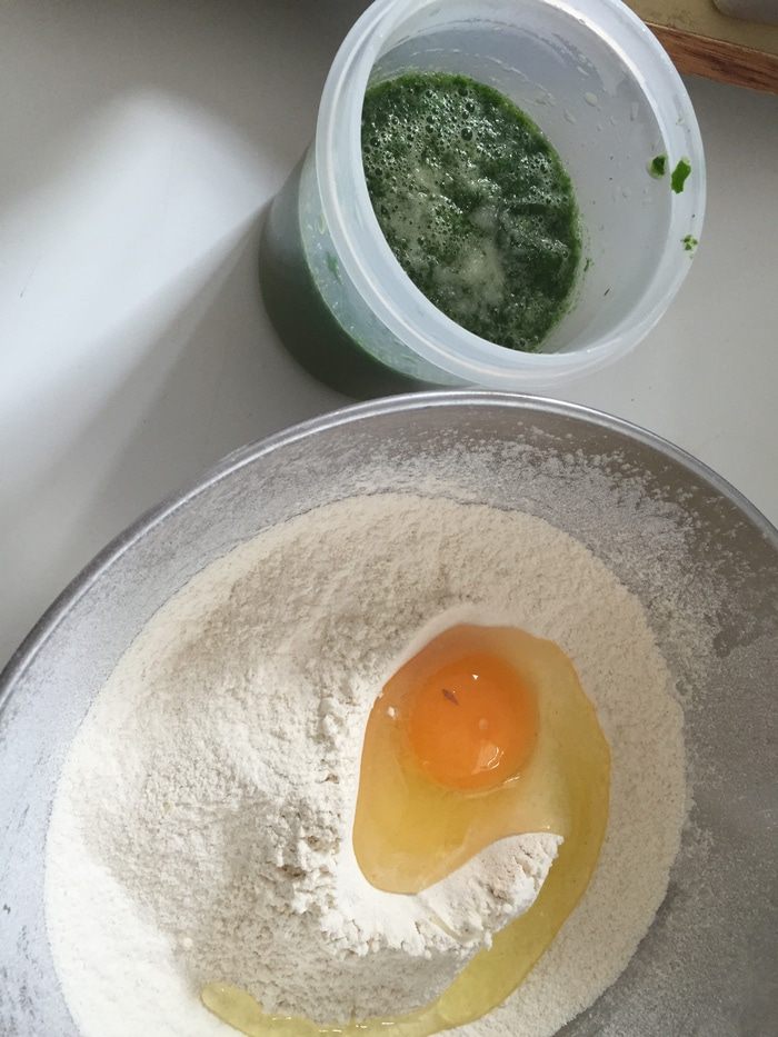 Для начала возьмём весь шпинат и немного буквально несколько минут "поварим" его в небольшом количестве воды. Окрашенную воду сливаем в ёмкость, добавляем туда горсть шпината и пюрируем блендером. Шпинат отставляем пока. В миску просеиваем муку с солью, разбиваем яйцо, начинаем замешивать тесто. Постепенно добавляем шпинатную воду. Нам нужно вымесить мягкое, но достаточно упругое пельменное тесто.