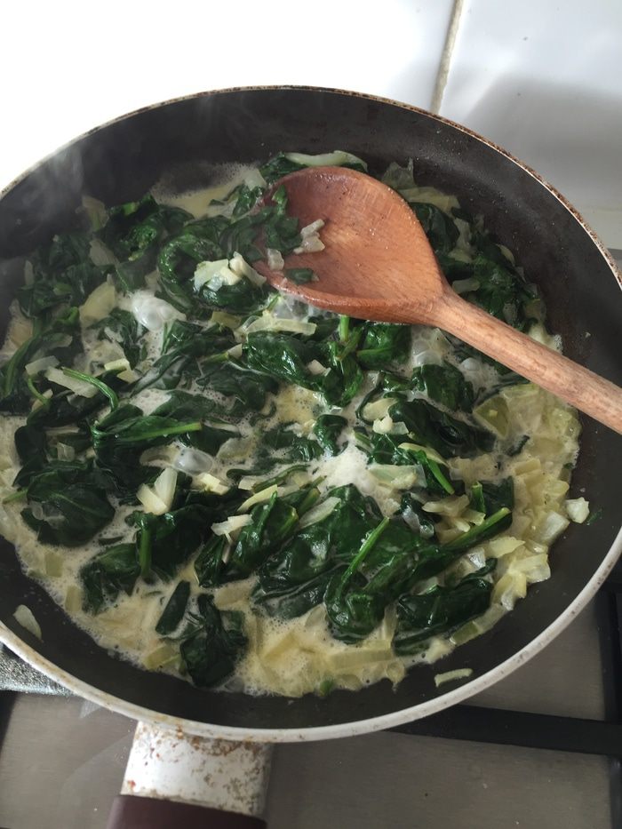 Пока займёмся начинкой. Лук и чеснок чистим, мелко нарезаем. Обжариваем на смеси сливочного и оливкового масла. Добавляем наш шпинат, прогреваем, заливаем сливки, солим, перчим + мускатный орех молотый. Слегка увариваем.