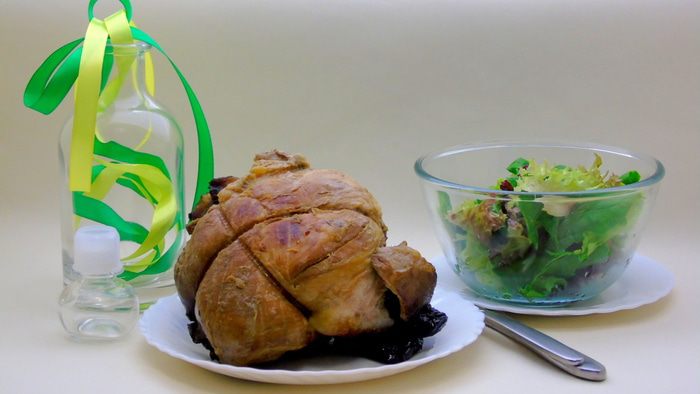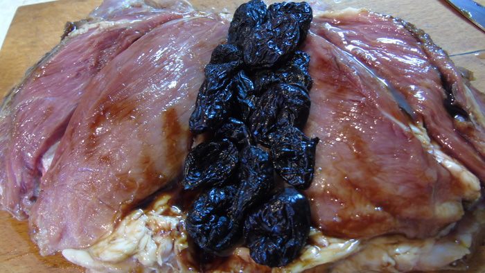 В середину мяса выкладываем чернослив.