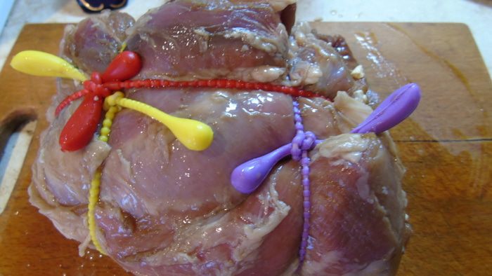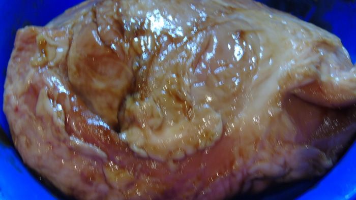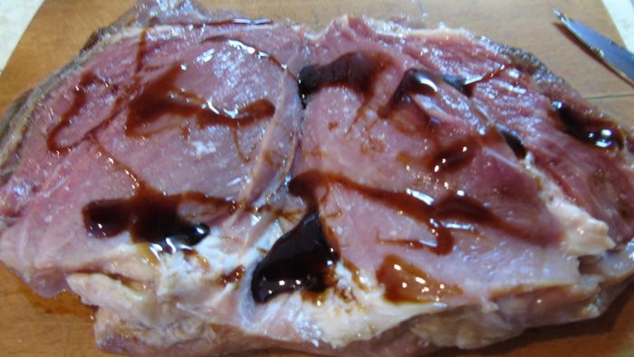 Мясо, у меня свиное «яблочко», разрезаем книжкой и очень хорошо натираем соусом наршараб и оставляем на ночь.