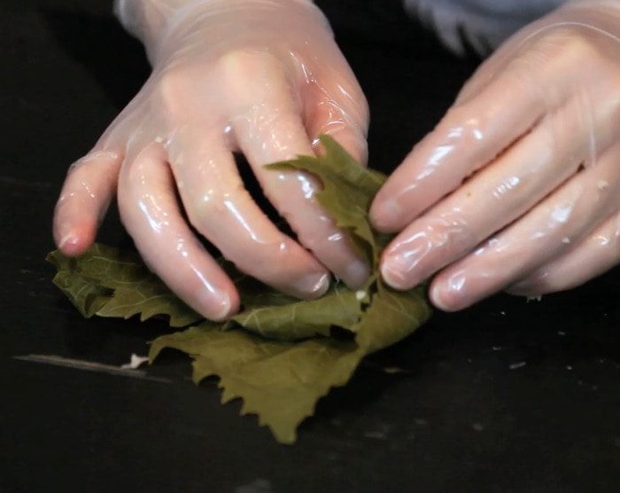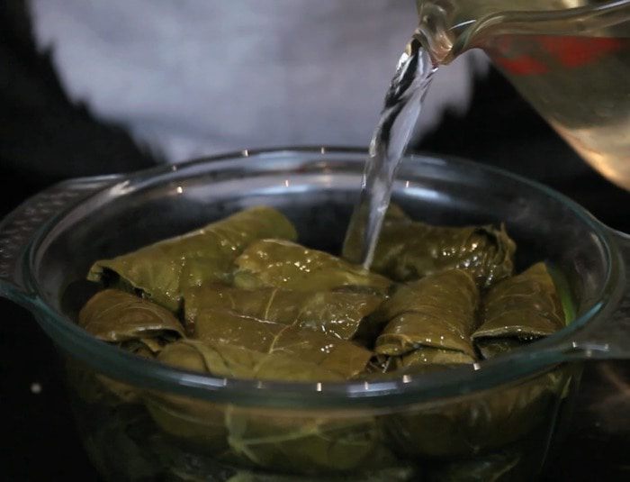 1. Готовить долму в духовке: для этого разогреть её на 205°С. Долму сложить в жаропрочную ёмкость, залить бульоном, накрыть крышкой и убрать на 1 час;