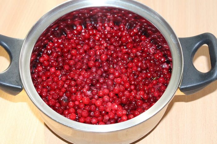 Бруснику залить кипятком, дать постоять 5 минут, пробить блендером, протереть через сито.