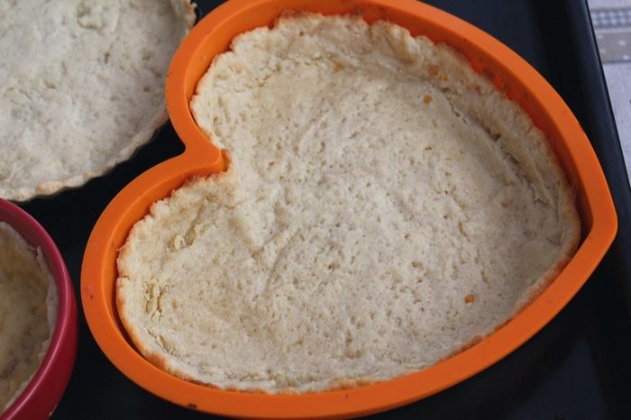 На тесто положить бумагу для выпечки, насыпать горох (или другой груз) и выпекать при 200°С 10 минут. Убрать горох и бумагу, выпекать еще 5 минут.