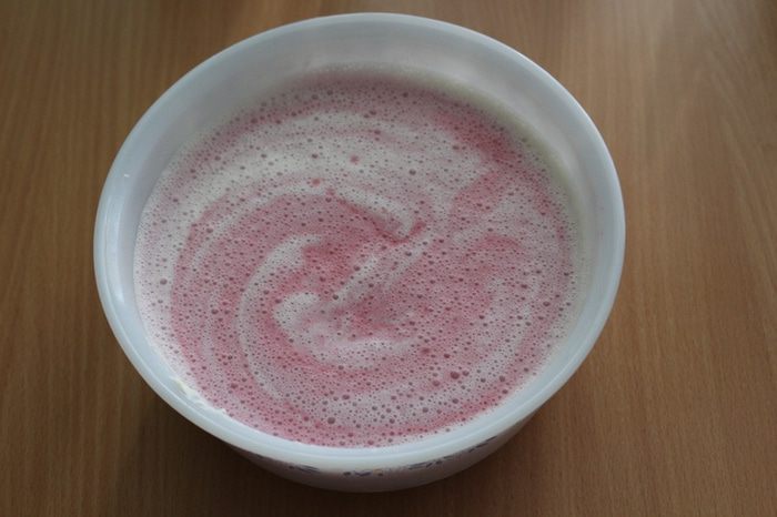 Добавить брусничное пюре, перемешать, не усердствуя.