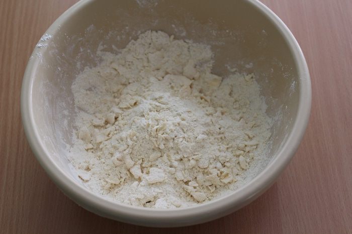 Холодное масло перетереть руками вместе с мукой и сахаром. Добавить яйцо и молоко, замесить тесто, долго месить не нужно.