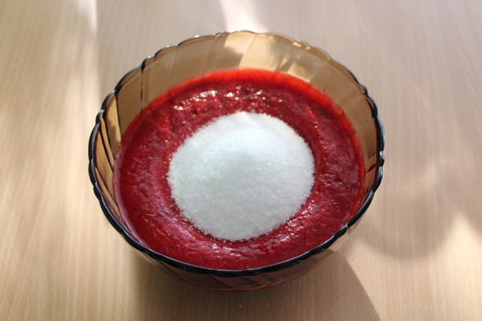 Для тарта нужно 400 г пюре. Добавить сахар, перемешать и отставить в сторону.