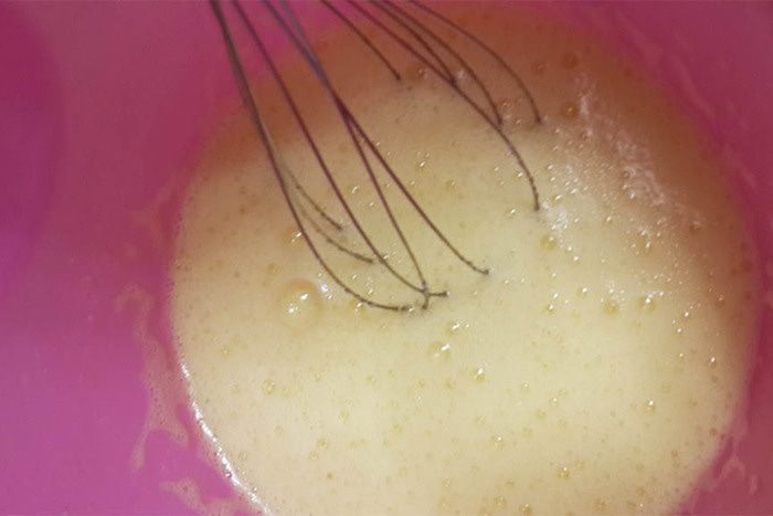 Для теста взбить желтки с сахаром. Добавить, взбивая, теплую воду.