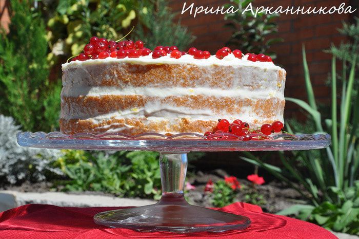 Каждый корж смазать кремом. Средний корж и верх посыпать смородиной. Бока тоже смазать кремом и ножом аккуратно снять лишний крем, двигая нож вертикально вдоль боков.