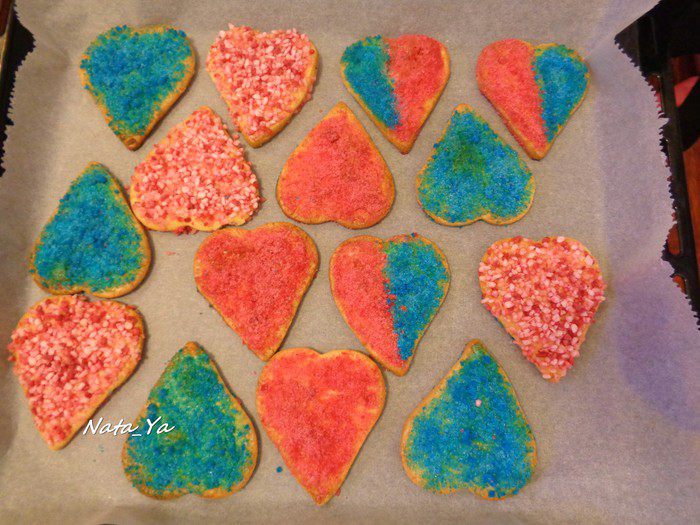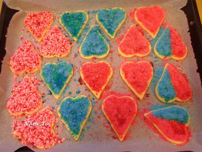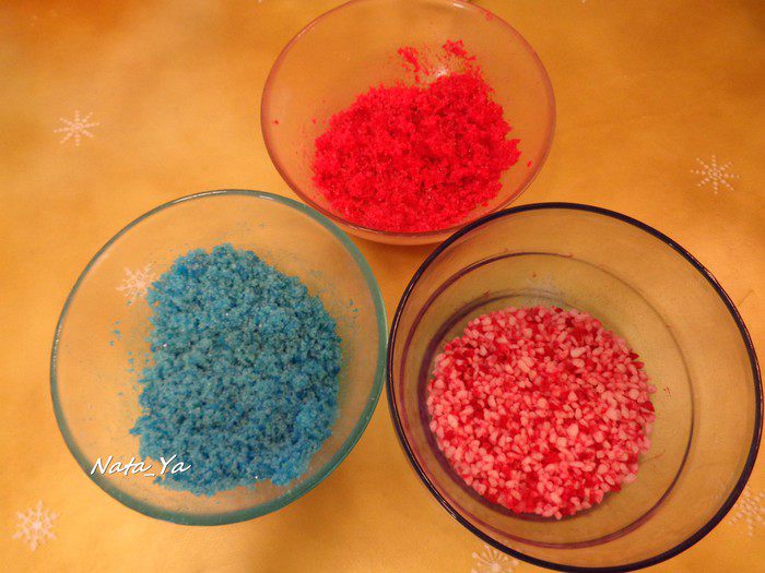 У меня получился красный и синий из обычного сахара, и розовый с вкраплениями из крупного сахара (хотя я использовала тот же красный краситель).