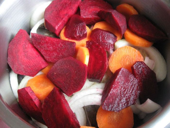 Лук, свеклу, морковь почистить. Нарезать крупными кружочками морковь, свеклу — полукольцами средней толщины, лук колечками.