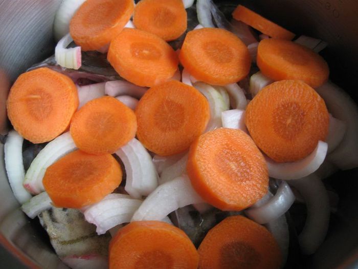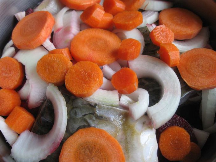 Затем несколько оставшихся кусочков рыбы и хвостовая часть. Затем — лук, морковь, ..
