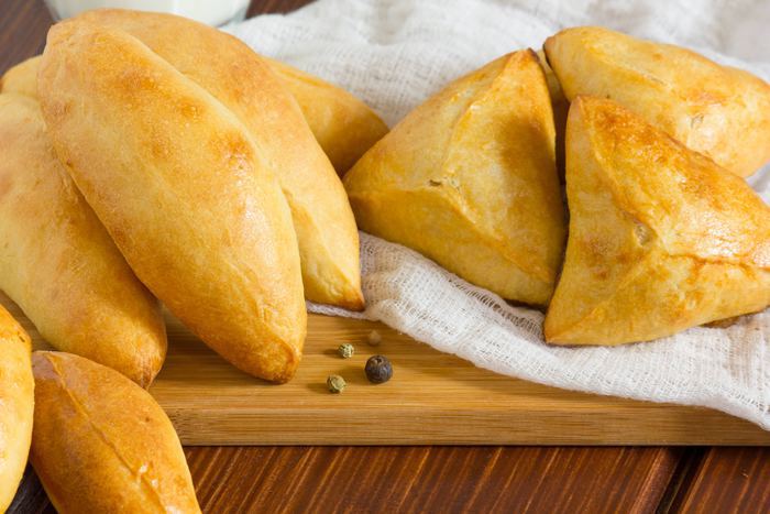 Выложите пирожки на застеленный пергаментом противень на расстоянии примерно 2 см друг от друга. Растопите сливочное масло, немного остудите и смешайте с желтком и 1 ч. л. теплой воды. Смажьте этой смесью пирожки. Выпекайте при 200°С до румяной корочки, примерно 15 мин. Подавайте горячими.