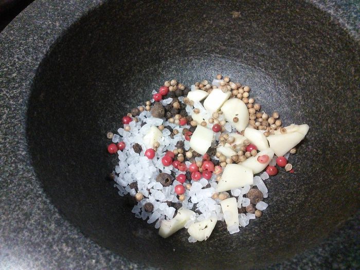 В ступке растереть специи с солью, чесноком. Добавить листики тимьяна и оливковое масло. Размешать.